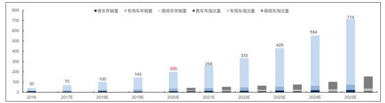 考慮2020年新能源汽車規(guī)劃累計銷量將超過500萬輛,2016~2020年年均增速將達61%;以五年為一個淘汰周期,從2020年開始測算新能車淘汰量;2025年新能車產銷占比達20%的規(guī)劃目標(2016汽車銷量2800萬輛),我們預計2025年新能源汽車銷量將達700萬輛。
