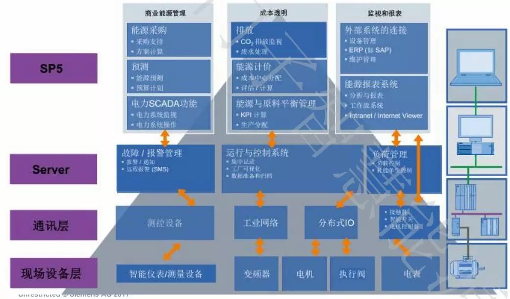 系統(tǒng)層:商業(yè)能源管理(能源采購、預測、電力SCADA功能)、能源與原料平衡管理、監(jiān)視和報表