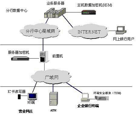 • 企業(yè)銀行用戶掛接終端安全模塊(TSM),通過TSM的安全處理(加密、MAC等),傳送到分中心前置機的服務(wù)器加密機,通過驗證來確定終端的真實性。