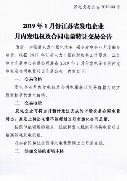 江蘇電力交易中心發(fā)布了《2019年1月份江蘇省發(fā)電企業(yè)月內發(fā)電權及合同電量轉讓交易公告》