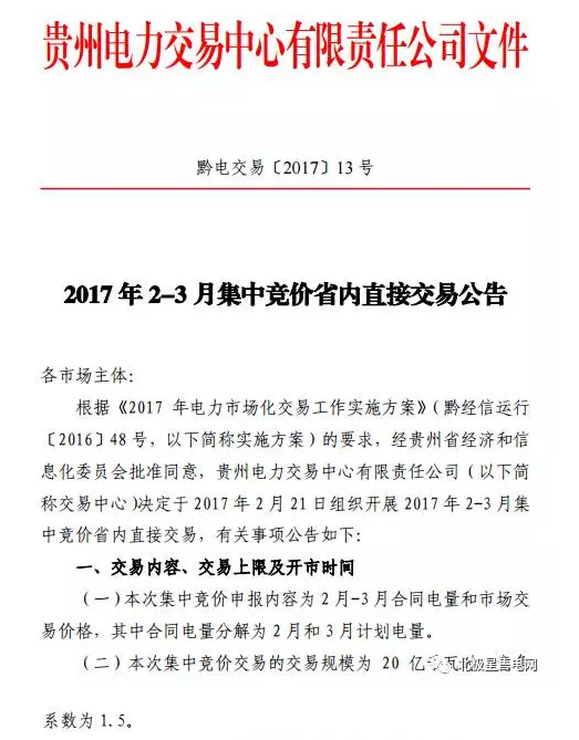 貴州2017年2-3月集中競價(jià)省內(nèi)直接交易公告