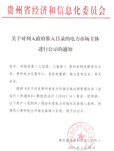 日前,貴州省經(jīng)信委發(fā)布了《關(guān)于對列入政府準(zhǔn)入目錄的電力市場主體進(jìn)行公示的通知》,一家企業(yè)被列為市場主體。詳情如下: