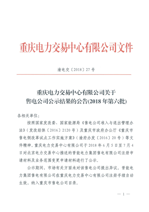 重慶電力交易中心今日發(fā)布了《重慶電力交易中心有限公司關于售電公司公示結(jié)果的公告(2018年第六批)》,北京推送的1家售電公司注冊生效。詳...
