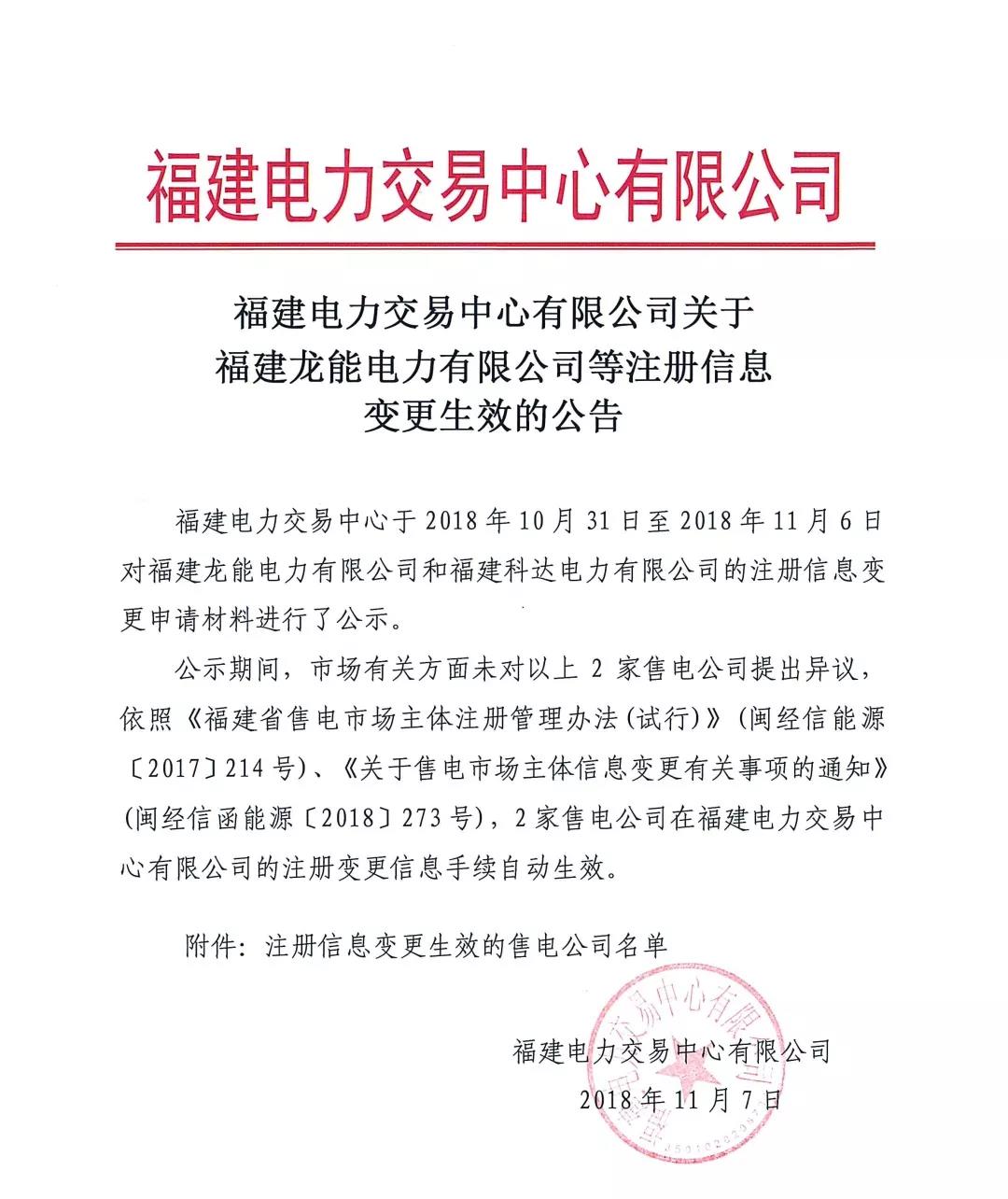 福建電力交易中心有限公司關(guān)于福建龍能電力有限公司等注冊(cè)信息變更生效的公告