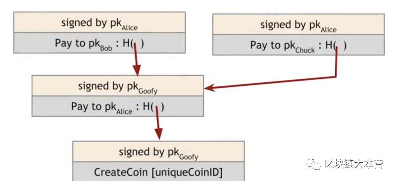 因?yàn)镚oofycoin只能通過(guò)加密操作發(fā)送,所以“this”是指向所討論虛擬貨幣的哈希指針。Goofy用他的私鑰簽署此交易,使其成為有效的交易。任何人都可以通過(guò)確認(rèn)Goofy的簽名來(lái)檢查它是否為有效的交易。