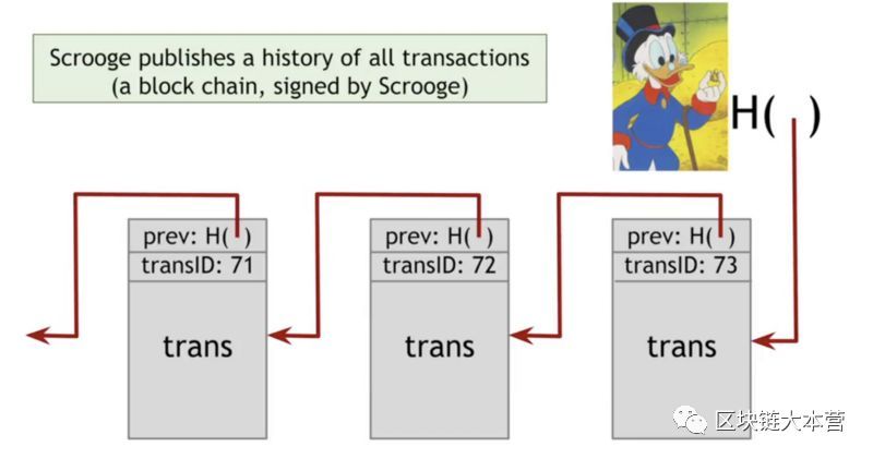 與GoofyCoin不同的是,Scrooge發(fā)布了一個(gè)包含所有交易歷史的區(qū)塊鏈。