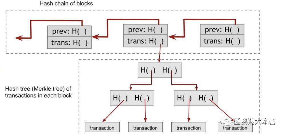 首先,當(dāng)我們將一個(gè)Merkle樹添加到傳遞加密哈希函數(shù)時(shí),會(huì)得到一個(gè)區(qū)塊鏈。每個(gè)區(qū)塊包含一組“merkleized”交易,并且這些區(qū)塊被鏈接在一起。