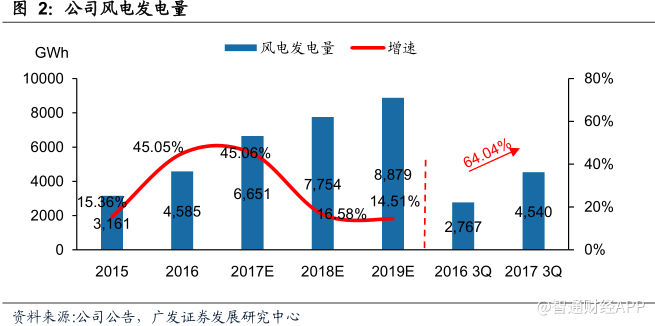 2017年第三季度,公司風電業(yè)務實現(xiàn)發(fā)電量11.1億千瓦時,同比增長147.28%,高于預期。截止2017年9月,公司風電累計發(fā)電量45.4億千瓦時,較去年同期增長64.04%。