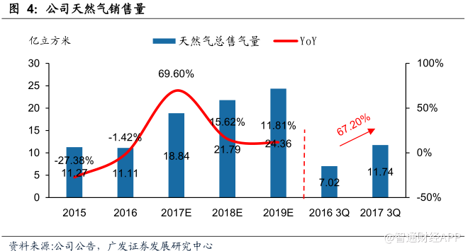 截止2017年九月底,公司累計實現(xiàn)天然氣售氣量11.74億立方米,同比增長67.2%,其中天然氣批發(fā)量為6.44億立方米,同比增加29.73%,天然氣零售量4.74億立方米,同比增加210.32%。零售業(yè)務的回暖主要得益由于“煤改氣”集中供暖以及沙河地區(qū)工業(yè)企業(yè)用氣量的恢復。近期沙河地區(qū)非用天然氣為燃料的部分玻璃企業(yè)停產整頓,而公司的玻璃企業(yè)客戶都是用天然氣為燃料的,將會受益于環(huán)保整頓,用氣會進一步增長。