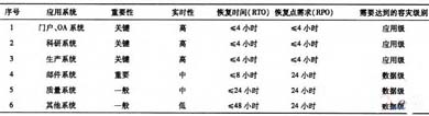 從表2可以看出,不同的業(yè)務系統(tǒng)依據(jù)它們的重要性和實時性的不同,需要達到的容災級別也是不同的,OA系統(tǒng)、科研系統(tǒng)、生產(chǎn)系統(tǒng)是關系企業(yè)業(yè)務開展的關鍵業(yè)務系統(tǒng),擬設計達到應用級別的容災,而郵件系統(tǒng)、質(zhì)量系統(tǒng)、和其它系統(tǒng)擬建設達到數(shù)據(jù)級容災的要求。