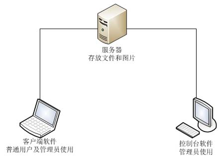 超級圖庫管理軟件經(jīng)過簡單的定制后,形成了《電力監(jiān)理業(yè)務(wù)在線管理系統(tǒng)》軟件。該軟件由服務(wù)器、控制臺、客戶端三部分組成,如下圖所示。