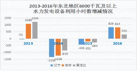 2016年該區(qū)域6000千瓦及以上水力發(fā)電設(shè)備平均利用小時數(shù)總體優(yōu)于2015年,東北區(qū)域三省均有一定幅度上漲,但總體仍低于全國平均水平。2017年,在東北地區(qū)全社會用電量增速放緩前提下,東北地區(qū)6000千瓦及以上水力發(fā)電設(shè)備利用小時數(shù)上升空間有限。
