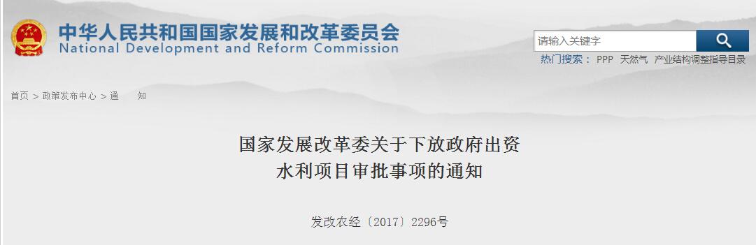 發(fā)改委發(fā)布《國(guó)家發(fā)展改革委關(guān)于下放政府出資水利項(xiàng)目審批事項(xiàng)的通知》,為深入推進(jìn)放管服改革,經(jīng)報(bào)國(guó)務(wù)院同意,對(duì)政府出資的地方水利項(xiàng)目