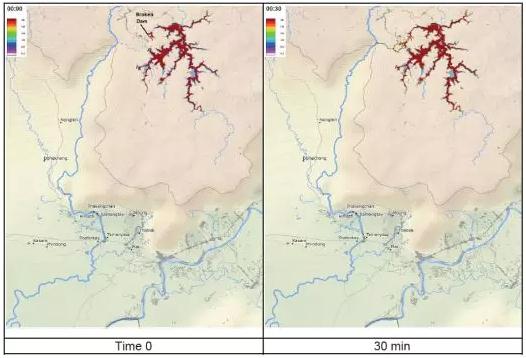 下圖為從潰壩開始,不同時(shí)間后洪水演進(jìn)的計(jì)算分析結(jié)果。