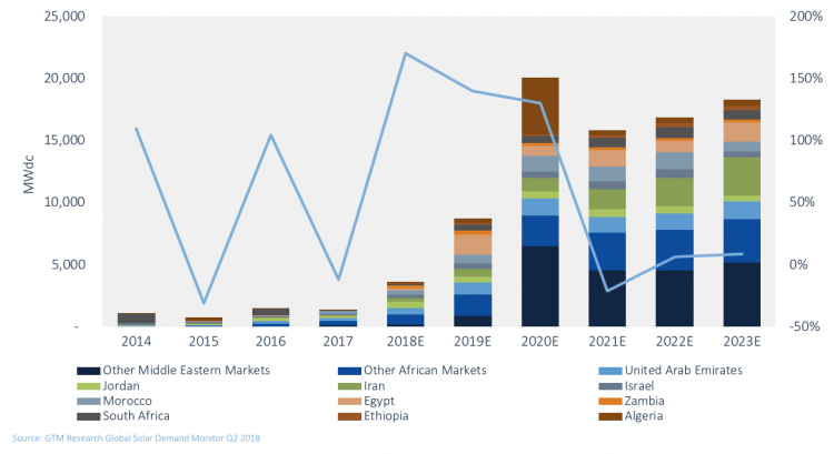 據(jù)GTMResearch的數(shù)據(jù)顯示,2018年中東和非洲地區(qū)的光伏需求有望增長(zhǎng)170%。