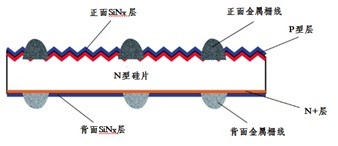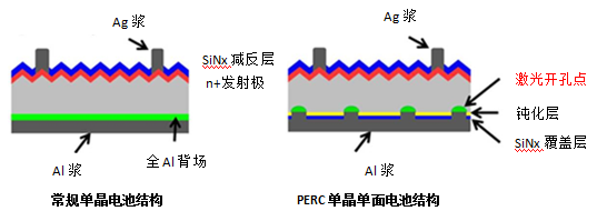 和常規(guī)單晶電池工藝相比,PERC單晶電池主要增加了背面鈍化、背面SiNx膜沉積和激光打孔三道工藝。其中激光打孔工藝是利用一定脈沖寬度的激光在去除部分覆蓋在電池背面的鈍化層和SiNx覆蓋層,以使絲網(wǎng)印刷的鋁漿可以與電池背面的硅片形成有效接觸,從而使光生電流可以通過Al層導(dǎo)出。因Al漿無法穿透SiNx層,其余未被激光去除的鈍化層被覆蓋在其上方的SiNx覆蓋層保護(hù),發(fā)揮降低表面復(fù)合速率,提升效率的作用。