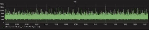 實時計算引擎使用了數(shù)據(jù)庫總機器規(guī)模 0.1% 的資源, 實現(xiàn)了全網(wǎng)秒級監(jiān)控數(shù)據(jù)的計算,平均每秒處理超過 1000 萬項性能指標,平均寫入 TPS 600 萬,峰值 TPS 1400 萬,下圖是雙 11 期間 HiTSDB TPS 趨勢曲線。