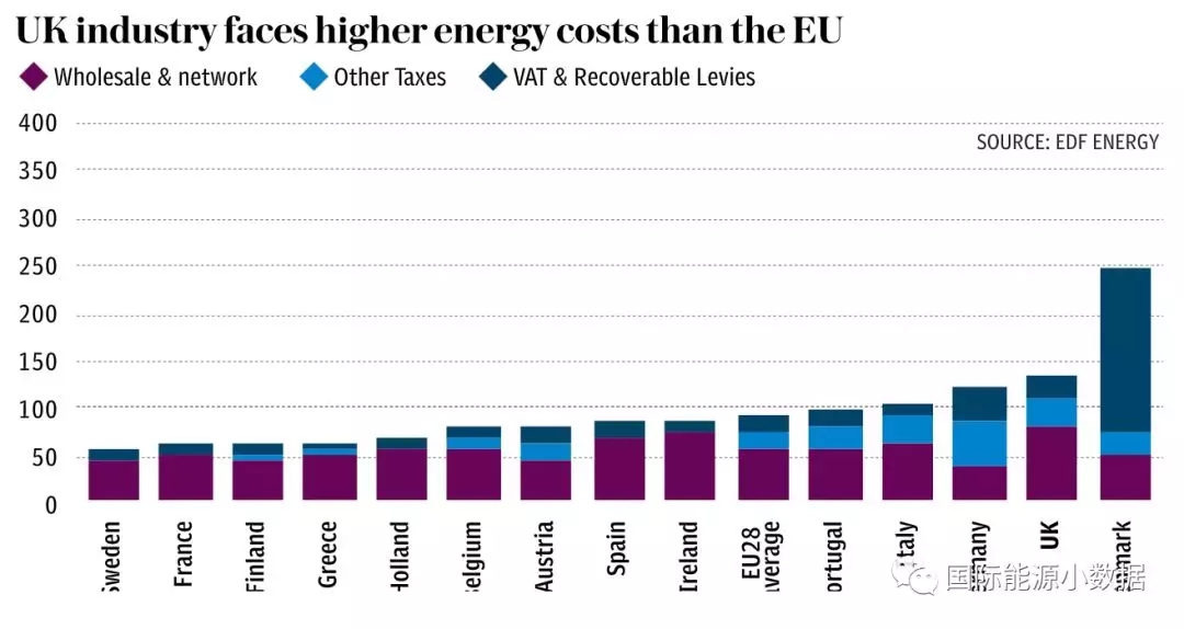 英國低碳轉(zhuǎn)型也是有成本的,目前英國工業(yè)用電價(jià)格在歐盟僅次于丹麥,排在第2位,在一定程度影響了英國企業(yè)的競爭性。