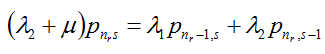 圖1中所體現(xiàn)出來的優(yōu)先制度為:當(dāng)r>0時,(r,s+1)狀態(tài)不能轉(zhuǎn)移到(r,s)狀態(tài),因為一旦有線路空閑,A隊就會占用線路,就轉(zhuǎn)移到(r-1,s+1)狀態(tài)。由圖1可寫出穩(wěn)態(tài)下的系統(tǒng)狀態(tài)方程: