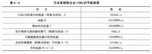 日本某鋼鐵企業(yè)對其CDQ技術(shù)的節(jié)能效果進(jìn)行計(jì)算,計(jì)算結(jié)果如表4-4所示。年節(jié)約電能850MWh/a,總的有效燃料節(jié)約量(換算為原油)4730kL/a。