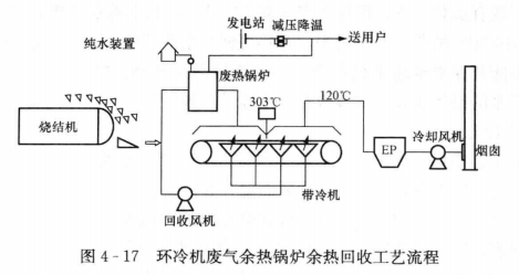 (2)環(huán)冷機(jī)廢氣余熱鍋爐。高溫廢氣從環(huán)冷機(jī)上部的兩個(gè)排氣筒抽出經(jīng)重力除塵器進(jìn)入余熱鍋爐進(jìn)行換熱,鍋爐排出的150~200℃的廢氣由循環(huán)風(fēng)機(jī)送回環(huán)冷機(jī)風(fēng)箱連通管循環(huán)使用。系統(tǒng)中專設(shè)一臺常溫風(fēng)機(jī),其作用是當(dāng)余熱回收設(shè)備運(yùn)行時(shí)補(bǔ)充系統(tǒng)漏風(fēng)。余熱回收設(shè)備不運(yùn)行而燒結(jié)生產(chǎn)仍在進(jìn)行時(shí),可打開余熱回收區(qū)的排氣筒閥門,啟用該風(fēng)機(jī),以保證環(huán)冷機(jī)的正常運(yùn)行并使它卸出冷燒結(jié)礦的溫度低于150℃,其工藝流程如圖4-17所示。