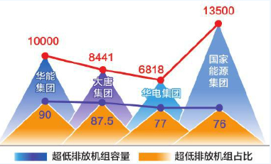 作為改造主力軍,新五大發(fā)電集團(tuán)認(rèn)真落實(shí)大氣污染防治要求,全力推進(jìn)超低排放提速擴(kuò)圍,節(jié)能環(huán)保工作實(shí)現(xiàn)質(zhì)的飛躍。其中,國(guó)家能源集團(tuán)完成超低排放改造機(jī)組容量最多,為13500萬(wàn)千瓦,占現(xiàn)役煤電機(jī)組容量76%。華能集團(tuán)超低排放機(jī)組占比最高,超過(guò)90%,共計(jì)10000萬(wàn)千瓦,超前國(guó)家進(jìn)度計(jì)劃要求。大唐集團(tuán)累計(jì)完成超低排放機(jī)組改造達(dá)到202臺(tái),共計(jì)8441萬(wàn)千瓦,占在役燃煤機(jī)組容量的87.5%,高出中央發(fā)電企業(yè)平均值6個(gè)百分點(diǎn)。華電集團(tuán)累計(jì)170臺(tái)6818萬(wàn)千瓦煤電機(jī)組完成改造,容量占比達(dá)到77%,東部地區(qū)煤電機(jī)組已全部實(shí)現(xiàn)超低排放。
