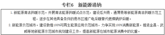 7.創(chuàng)建高比例新能源示范城市。率先在敦煌市創(chuàng)建高比例新能源示范城市。探索在一個(gè)城市整體實(shí)現(xiàn)城市能源轉(zhuǎn)型,形成以局域智能電網(wǎng)為基礎(chǔ),風(fēng)電光電互補(bǔ)、光伏光熱協(xié)同、多種能源融合發(fā)展的能源產(chǎn)消格局,建成100%可再生能源電力城市、可再生能源供熱城市、可再生能源公共交通城市。
