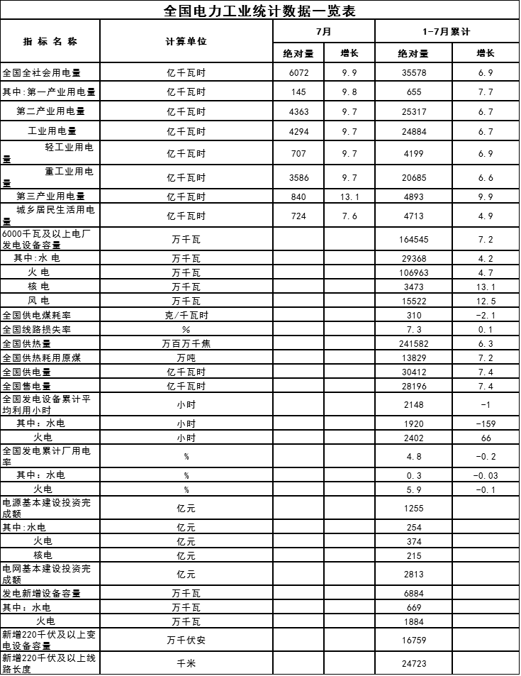 1-7月份全國電力工業(yè)統(tǒng)計數(shù)據(jù):全國售電量28196億千瓦時 增7.4%