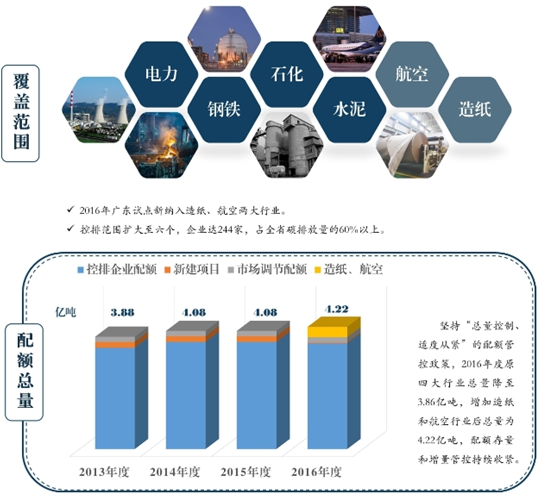 2013年,廣東首先將電力、鋼鐵、石化、水泥四大行業(yè)納入碳排放控制范圍,經(jīng)過三年“摸著石頭過河”的嘗試,已經(jīng)初步建立起有效針對四大行業(yè)的排控機制。去年,廣東在保證原有機制順利運行的前提下,在碳排放權(quán)交易試點中納入了航空和造紙兩大行業(yè),現(xiàn)有的六大行業(yè)排控覆蓋244家企業(yè),占全省碳排放量的60%以上。與此同時,廣東在繼續(xù)推進碳排放交易試點工作中,牢牢堅持“總量控制、適度從緊”的配額管控政策:2013年度四大行業(yè)配額總量為3.88億噸,2014年度為4.08億噸,2015年度為4.08億噸。而到了2016年度,四大行業(yè)配額總量降至3.86億噸,增加造紙和航空后總量為4.22億噸,配額存量和增量管控持續(xù)收緊。