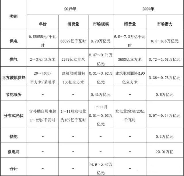 從市場需求看,若僅選取供電、供氣、北方城鎮(zhèn)供熱、分布式光伏、節(jié)能服務(wù)、微電網(wǎng)、儲能七個主要的業(yè)務(wù)領(lǐng)域進行分析測算,2017年市場規(guī)模超4.9~5.47萬億元,到2020年市場潛力至少為5.28~6.29萬億元,具體估算如表2所示。