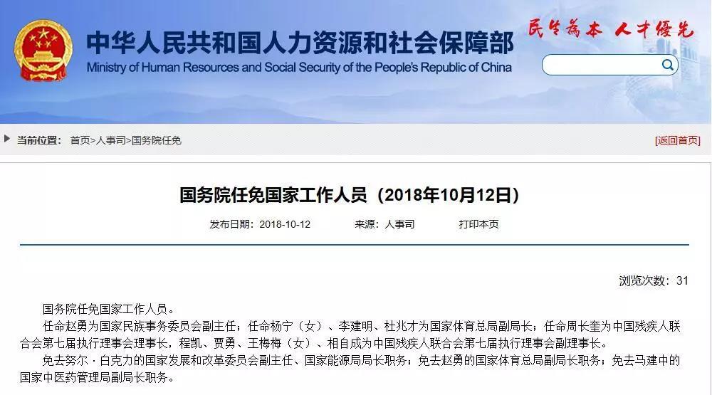 免去努爾·白克力的國家發(fā)展和改革委員會副主任、國家能源局局長職務;免去趙勇的國家體育總局副局長職務;免去馬建中的國家中醫(yī)藥管理局副局長職務。