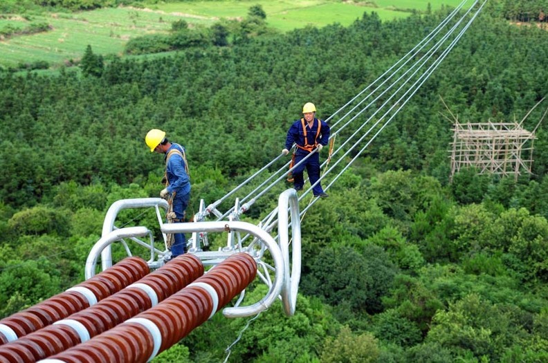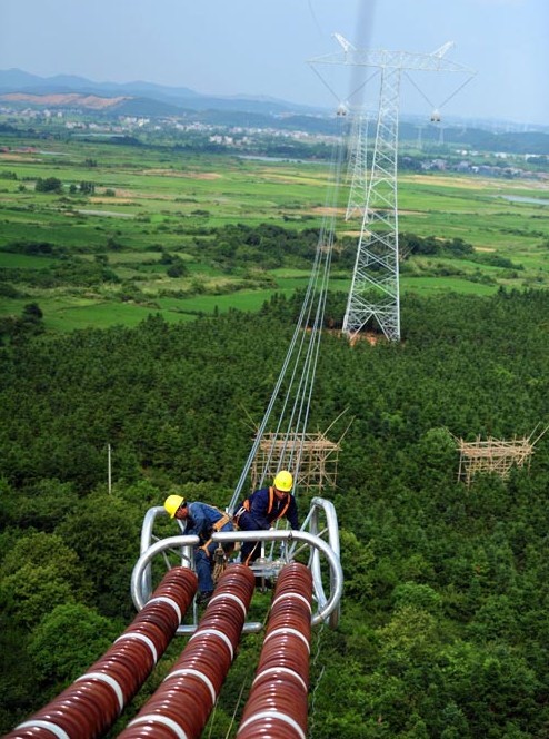 7月30日,在江西省高安市獨(dú)城鎮(zhèn)境內(nèi),幾名電力施工人員冒著高溫在70米高的特高壓輸電鐵塔上安裝附件。當(dāng)日,江西省高安市最高氣溫達(dá)到37攝氏度。400余名安徽送變電工程公司的施工人員頭頂烈日,堅(jiān)守在溪洛渡左