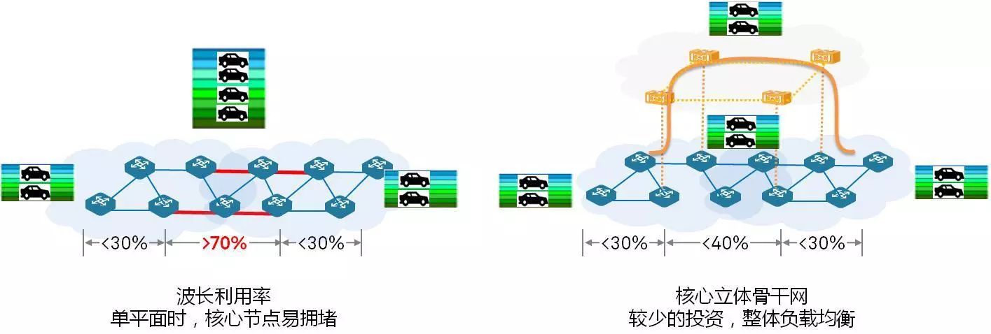 對(duì)于上述問(wèn)題,針對(duì)現(xiàn)有骨干網(wǎng)的演進(jìn),方法便是立體式建網(wǎng)。立體建網(wǎng)的理念,其實(shí)并不新鮮,這早在高速公路中廣為應(yīng)用,高速公路與骨干網(wǎng)都是承載網(wǎng)絡(luò),不同的是,高速公路承載的是車(chē)流,骨干網(wǎng)承載的是信息流,在高速公路上,立交橋便是解決擁塞的方案。通過(guò)對(duì)擁堵路段的多平面建設(shè),解決了車(chē)流擁塞、提升了行車(chē)時(shí)間,并通過(guò)多車(chē)道增強(qiáng)了行車(chē)的安全,既不影響現(xiàn)有交通,也最大程度降低了投資。這些問(wèn)題,對(duì)應(yīng)的正是骨干網(wǎng)的擁塞、時(shí)延和可靠性問(wèn)題。