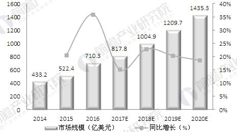 2014-2020年全球云計(jì)算市場(chǎng)規(guī)模及預(yù)測(cè)(單位:億美元,%)