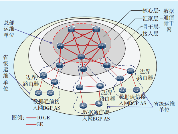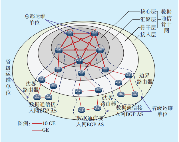 管理模式為:數(shù)據(jù)通信骨干網(wǎng)設(shè)備及網(wǎng)絡(luò)的路由策略、規(guī)范制定以及涉及全網(wǎng)范圍的項目投資和網(wǎng)絡(luò)優(yōu)化權(quán)限全部上收至總部層面,網(wǎng)絡(luò)設(shè)備運行監(jiān)視、配置管理、調(diào)度協(xié)調(diào)、資源分配、故障處理則由屬地省級機(jī)構(gòu)負(fù)責(zé)。