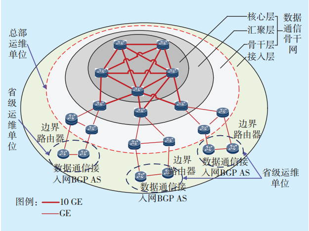 傳統(tǒng)的網(wǎng)絡(luò)運維模式[12]從網(wǎng)絡(luò)架構(gòu)、網(wǎng)絡(luò)規(guī)模和覆蓋范圍、路由控制3個方面都無法滿足新的網(wǎng)絡(luò)管理需求。網(wǎng)絡(luò)結(jié)構(gòu)的變化使得原有的“總部—省公司”兩級網(wǎng)絡(luò)運維體系出現(xiàn)了不適應(yīng),骨干域設(shè)備數(shù)量增加了數(shù)倍,運行管理的深度很難保持原有質(zhì)量。由于總部至省級機(jī)構(gòu)的邊界已經(jīng)不存在,已無法沿用原有的在省、地市邊界部署路由控制手段以限制故障影響范圍的模式。