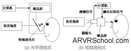 頭盔顯示式被廣泛應(yīng)用于增強(qiáng)現(xiàn)實(shí)系統(tǒng)中,用于增強(qiáng)用戶的沉浸感。按照實(shí)現(xiàn)原理大致分為光學(xué)透視式和視頻透視式兩類,分別如圖所示。光學(xué)透視式增強(qiáng)現(xiàn)實(shí)系統(tǒng)具有簡(jiǎn)單、分辨率高、沒有視覺偏差等優(yōu)點(diǎn),但它同時(shí)也存在著定位精度要求高、延遲匹配難、視野相對(duì)較窄和價(jià)格高等缺陷。視頻透視式增強(qiáng)現(xiàn)實(shí)系統(tǒng)采用的基于視頻合成技術(shù)的穿透式HMD(Video See-through HMD),利用攝像機(jī)采集到的真實(shí)環(huán)境的視頻信息與計(jì)算機(jī)生成的三維虛擬信息相融合,從而加強(qiáng)用戶對(duì)真實(shí)世界數(shù)據(jù)信息的認(rèn)知能力。