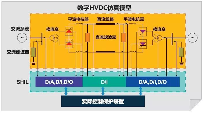 全數(shù)字仿真程序HYPERSIM與控制保護(hù)裝置交互的僅為(控制)信號(hào)量,電壓一般在-15V~+15V之間,此時(shí)的接口為信號(hào)接口。H YPERSIM經(jīng)D/A或D/O輸出開(kāi)關(guān)量、分接頭位置信息等給直流控制保護(hù)裝置,同時(shí),控保裝置通過(guò)A/D、D/ I將相關(guān)控制信號(hào)反饋至仿真程序,交互信號(hào)傳輸由專用電纜或光纖實(shí)現(xiàn)。