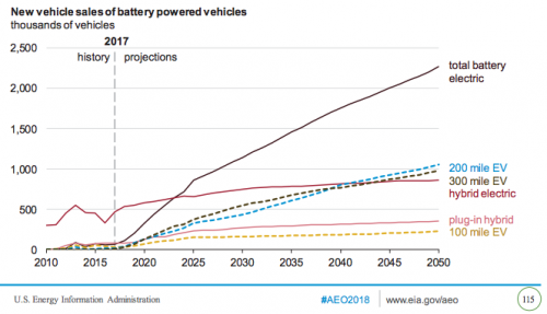 美國能源情報(bào)局的《年度能源展望匯報(bào)》也預(yù)測了2018年電動車的銷量會增加:電動車占汽車總銷售量的比例將從2017年的不到1%,增加到2050年的12%。
