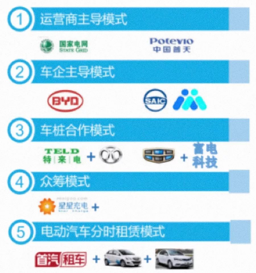 總結(jié)來(lái)看,當(dāng)前國(guó)內(nèi)充電樁運(yùn)營(yíng)模式已由早期的運(yùn)營(yíng)商主導(dǎo)模式拓展為運(yùn)營(yíng)商主導(dǎo)、車(chē)企主導(dǎo)、車(chē)樁合作、眾籌、分時(shí)租賃等五大典型模式: