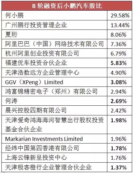 在A輪融資之前,小鵬汽車(廣州橙行智動汽車科技有限公司)的資金以何小鵬等創(chuàng)始團隊和天使投資為主。何小鵬也參與后續(xù)融資,因此他的股比還增長了,達到43.6%之多。A1和A2輪開始,諸多機構加持小鵬汽車,到了B輪,更有IDG等知名投資機構現身。在B輪之后,如果小鵬在2018年春節(jié)前所說的“會在今年過年前完成 50 億左右的融資”,此時總融資規(guī)模為50億左右。